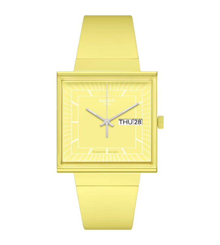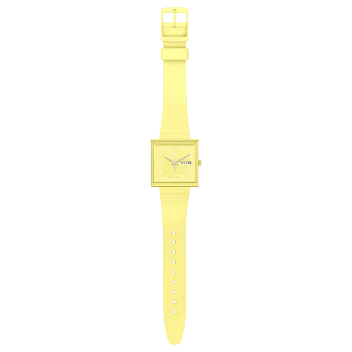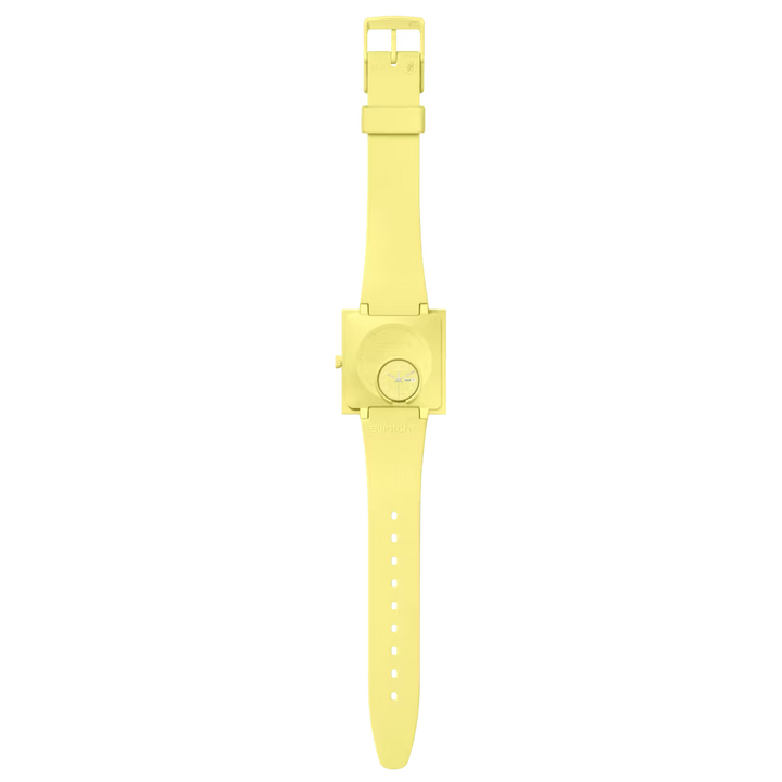 Carcasa patrata din BIOCERAMIC de culoare lemon are sticla biosursata din margine in margine, care ofera o vedere laterala a indexilor albi imprimati ai ceasului. Cadranul patrat are indicatoare argintii fosforescente si o fereastra zi-data la ora 3. Cadranul este completat de o curea biosursata integrata cu o catarama din BIOCERAMIC. Capacul imprimat al bateriei de pe spate infatiseaza o vedere frontala a ceasului.