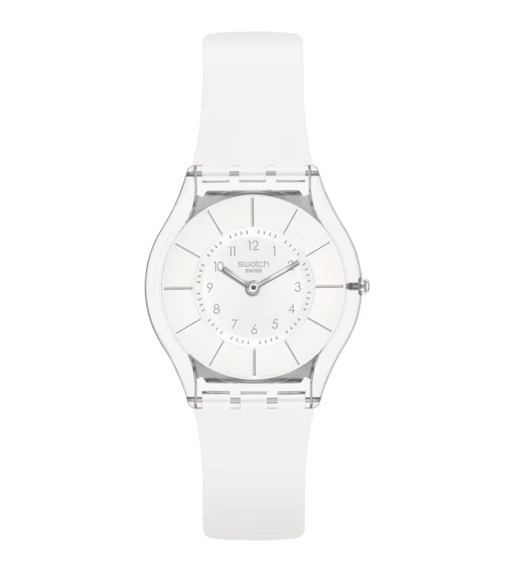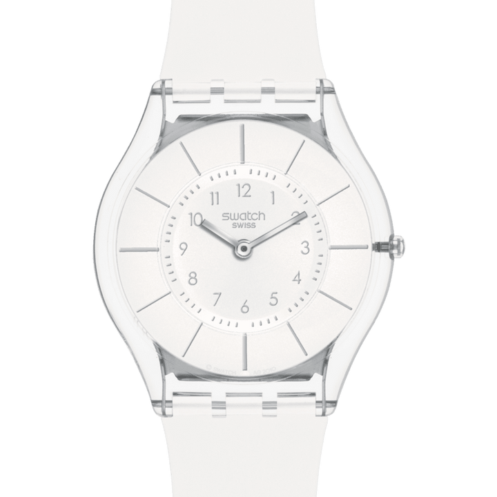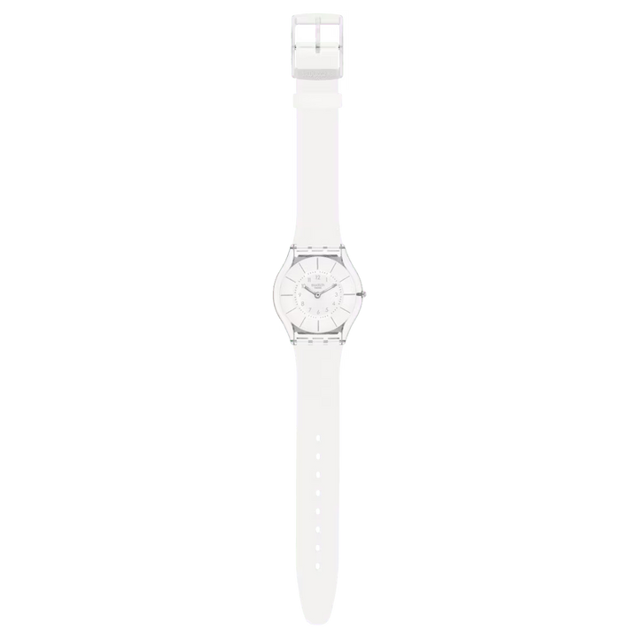 Acest ceas ultra-subtire are un cadran alb cu indexuri argintii stralucitoare si un geam biosursat montat intr-o carcasa transparenta, tot biosursata. Cureaua alba si bucla asortata se potrivesc cu cadranul, iar catarama transparenta completeaza designul.